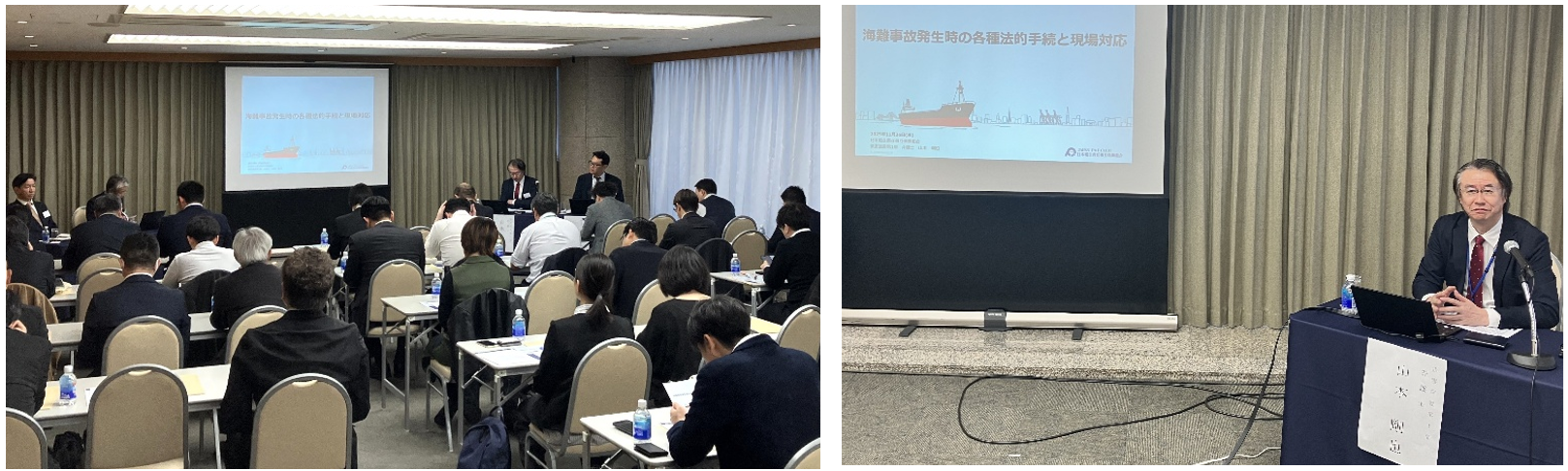 「海難事故発生時の各種法的手続と現場対応」をテーマに、当組合の損害調査業務を担当する山本剛也弁護士が講演しました。海難事故発生時の刑事手続、行政手続、そして民事上の責任について自身の経験を踏まえて、特に組合員の皆さまの関心が高いと思われるそれぞれの要点を詳しく解説しました。